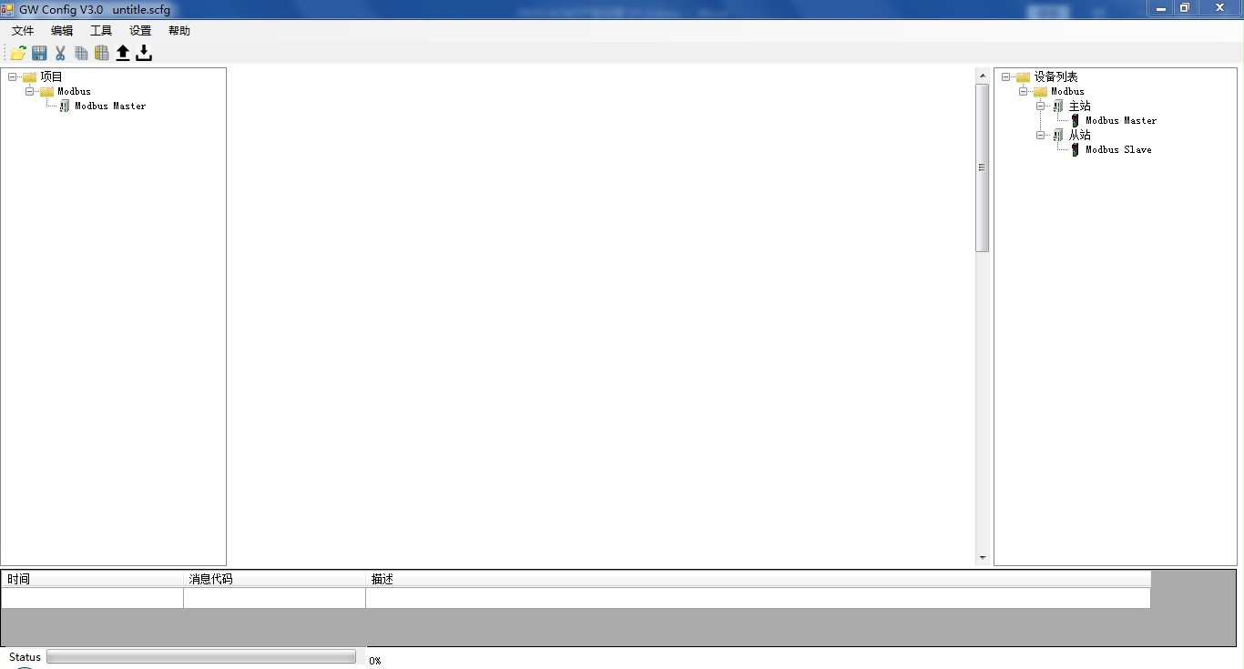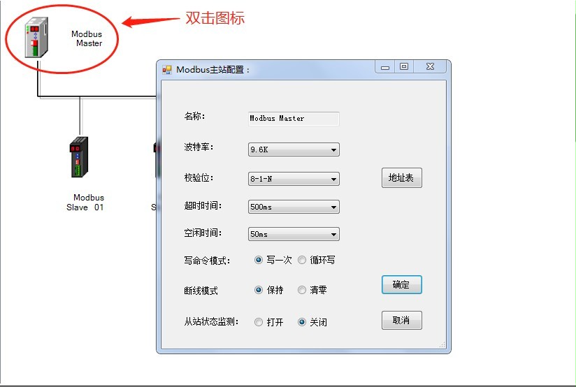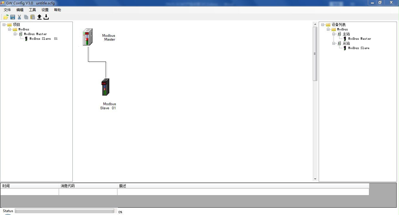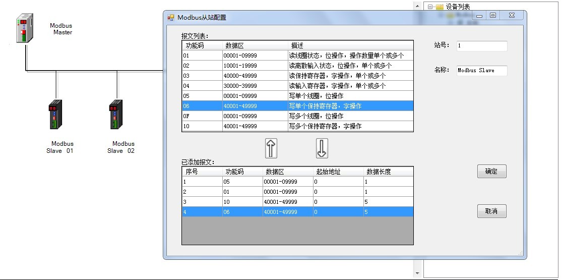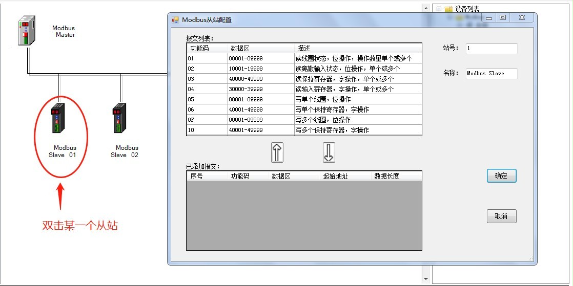 - 雙擊軟件右側(cè)設(shè)備列表中的“Modbus Slave”,可以添加一個(gè)從站到此主站的 Modbus 總線中,添加后可以在軟件的主窗口中看到 Modbus 總線中的所有站點(diǎn),如下圖: