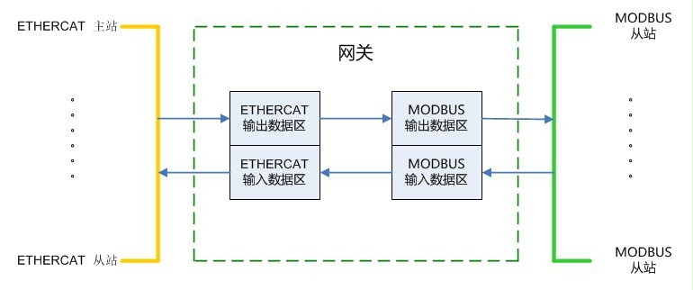 網(wǎng)關(guān)分別從 ETHERCAT 一側(cè)和 MODBUS 一側(cè)讀寫(xiě)數(shù)據(jù),存入各自的緩沖區(qū),網(wǎng)關(guān)內(nèi)部將緩沖區(qū)的數(shù)據(jù)進(jìn)行交換,從而實(shí)現(xiàn)兩邊數(shù)據(jù)的傳輸。