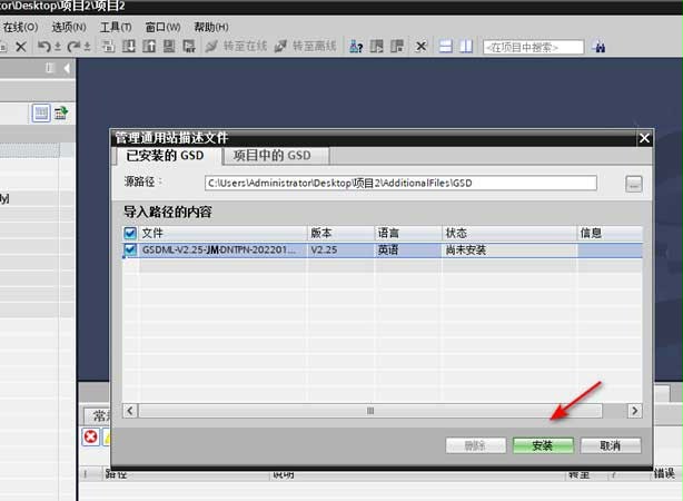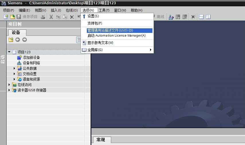 - 在博途中新建一個項目,通過“選項”——“管理通用站描述文件”添加網(wǎng)關(guān)的 GSD 文件。
