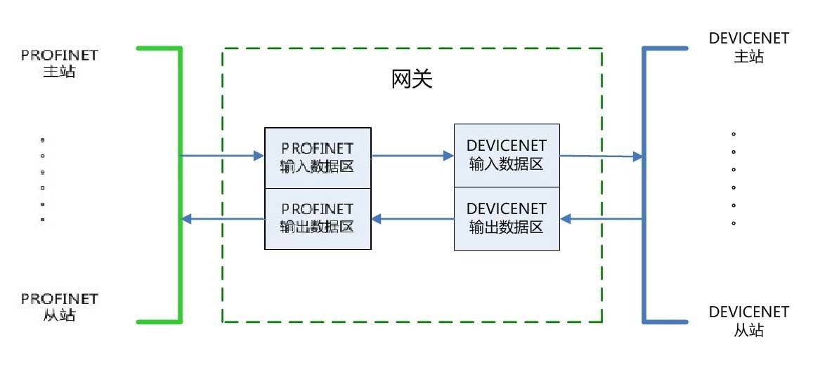 本網(wǎng)關(guān)連接到 PROFINET 總線中做為從站使用,連接到 DeviceNet 總線中做為從站使用。
