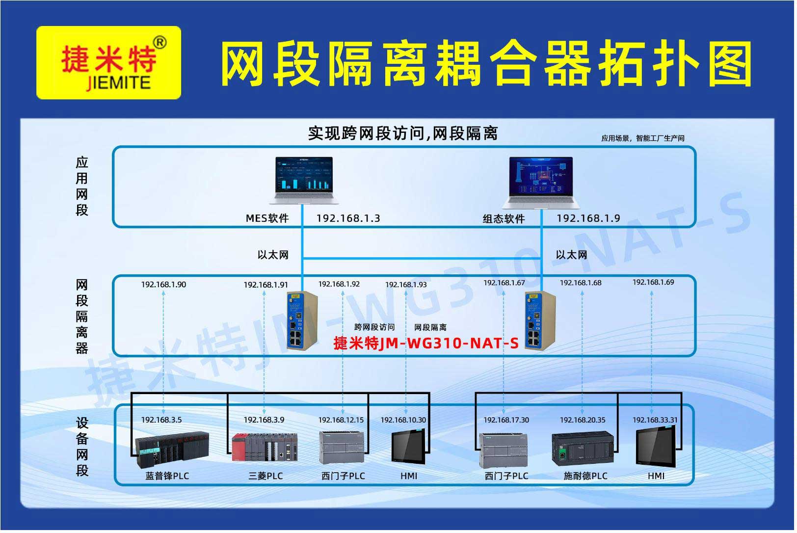 通常以太網(wǎng)或其他工業(yè)網(wǎng)絡(luò)協(xié)議(如PROFINET、Modbus TCP等)進(jìn)行通信。當(dāng)PLC位于不同的網(wǎng)段時,它們不能直接通信的,需要特殊的配置或ip地址轉(zhuǎn)換器(耦合器)設(shè)備來實(shí)現(xiàn)通信,不同網(wǎng)段的PLC通訊需要跨網(wǎng)段耦合器。用過捷米特功能模塊JM-ETH-NAT這款耦合器,它可以實(shí)現(xiàn)NAT跨網(wǎng)段的地址轉(zhuǎn)換的功能,即可將LAN1口所連接PLC的IP地址和端口號,映射到LAN2口任意IP地址和端口號;方便解決了現(xiàn)場設(shè)備無法修改 IP 地址和端口號的問題。