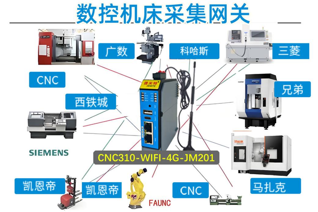 捷米特CNC310-WIFI-4G-JM201機(jī)床數(shù)據(jù)采集網(wǎng)關(guān),是一款性能成熟且穩(wěn)定的專業(yè)設(shè)備,為上述難題提供了有效的解決辦法。它具備較強(qiáng)的CNC機(jī)床實(shí)時(shí)數(shù)據(jù)采集功能,能夠較快地實(shí)現(xiàn)機(jī)床聯(lián)網(wǎng),較為精準(zhǔn)地采集CNC機(jī)床運(yùn)行數(shù)據(jù)以及生產(chǎn)數(shù)據(jù),打破信息流通的阻礙。可采集的部分品牌機(jī)床:發(fā)那科FANUC、海德漢、凱恩帝、三菱、兄弟、廣數(shù)、SIMENS、西鐵城、馬扎克、科哈斯、CNC等知名品牌的設(shè)備。