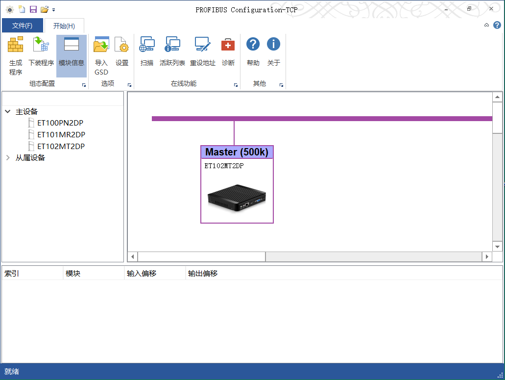 1. 添加PROFIBUS DP 主站:在左側(cè)設(shè)備窗口,選中“主設(shè)備”下的“ET102MT2DP”,按住鼠標(biāo)左鍵拖拽至右側(cè)編輯窗口釋放鼠標(biāo),主站模塊