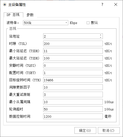 雙擊 Master 圖標(biāo),彈出“主設(shè)備屬性”對(duì)話框,在“DP 總線”標(biāo)簽頁(yè),包括總線波特率以及總線參數(shù),默認(rèn)主站地址為 2,默認(rèn)波特率為 500Kbps;選擇下拉框并選中對(duì)應(yīng)主站的波特率即可;
