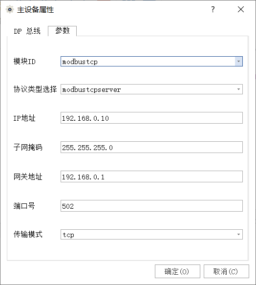 在“參數(shù)”標(biāo)簽頁(yè),配置PROFINET 網(wǎng)絡(luò)參數(shù),包括協(xié)議類型選擇、IP 地址、子網(wǎng)掩碼、網(wǎng)關(guān)地址、端口號(hào)等,配置完成點(diǎn)擊“確認(rèn)”,如下圖所示;