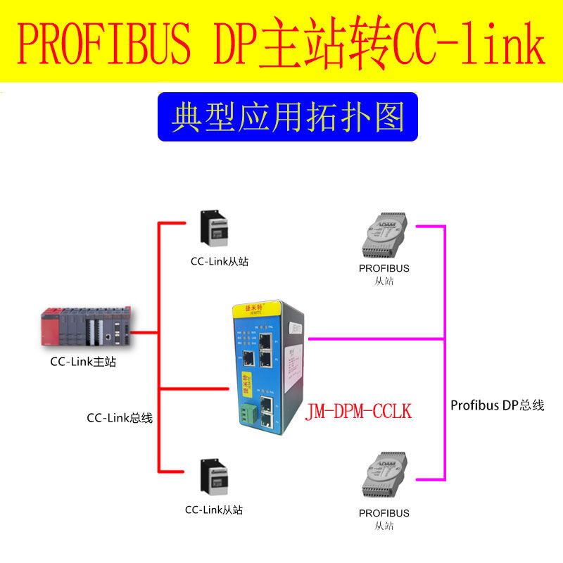 捷米特JM-DPM-CCLK網(wǎng)關(guān)連接到 CC-LINK總線中作為從站使用,連接到 PROFIBUS 總線中作為主站使用。即可以實(shí)現(xiàn)兩個不同協(xié)議的PLC做數(shù)據(jù)交換。