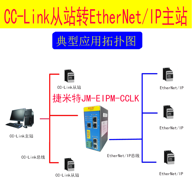 JM-EIPM-CCLK網(wǎng)關(guān)能夠?qū)崿F(xiàn)EtherNet/IP 接口儀表、變頻器、綜保、軟啟動器等設(shè)備接入到CC-LINK 網(wǎng)絡(luò)系統(tǒng)。網(wǎng)關(guān)在CC-LINK 一側(cè)是CC-LINK 從站,在另一側(cè)支持EtherNet/IP主站。