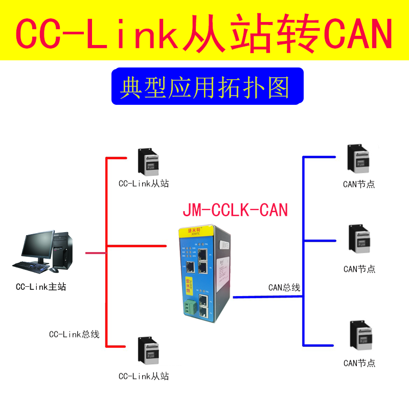 捷米特JM-CCLK-CAN接到CC-LINK 總線中作為從站使用,連接到CAN總線中根據(jù)節(jié)點(diǎn)號進(jìn)行讀寫。