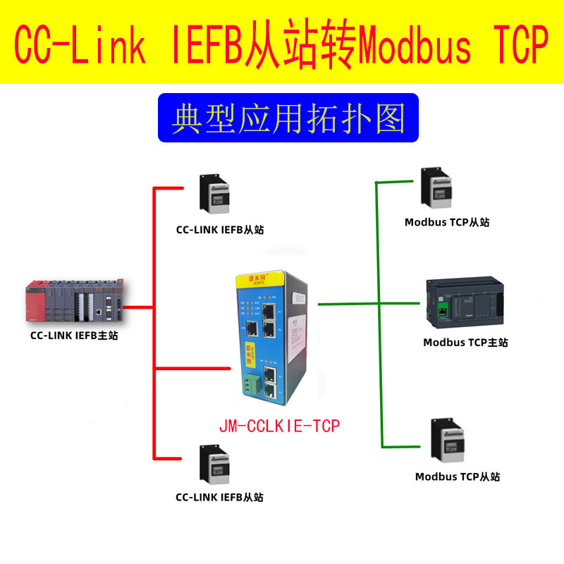 捷米特JM-CCLKIE-TCP網(wǎng)關(guān)能夠?qū)崿F(xiàn)Modbus TCP接口儀表、變頻器、綜保、軟啟動器等設(shè)備接入到CC-LINK IE FIELD BASIC網(wǎng)絡(luò)系統(tǒng)。網(wǎng)關(guān)在CC-LINK IE FIELD BASIC一側(cè)是CC-LINK IE 從站,在另一側(cè)支持Modbus TCP主站。
