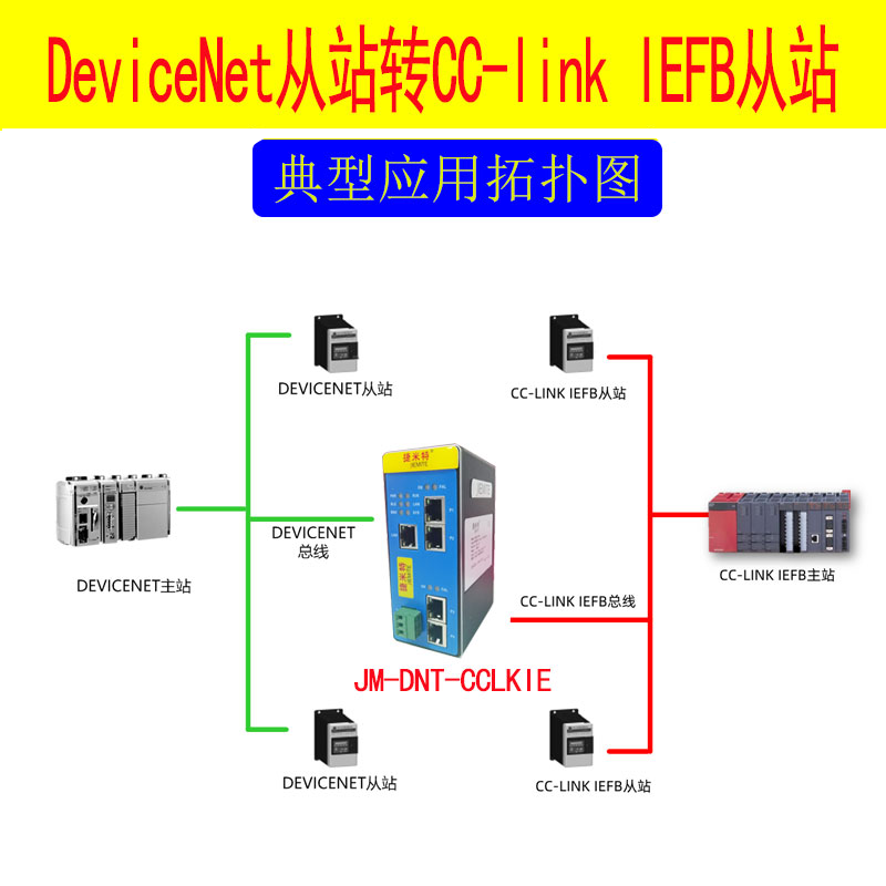 捷米特JM-DNT-CCLKIE網(wǎng)關(guān)連接到 CC-LINK IEFB總線中作為從站使用,連接到 DEVICENET總線中作為從站使用。即可以實現(xiàn)DEVICENET接口儀表、變頻器、綜保、軟啟動器或施耐德PLC等設(shè)備接入到三菱的CC-LINK IEFB網(wǎng)絡(luò)系統(tǒng)。