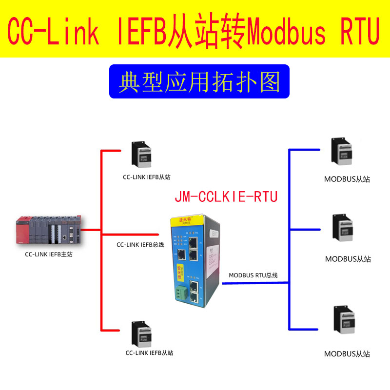 捷米特JM-CCLKIE-RTU網(wǎng)關(guān)能夠?qū)崿F(xiàn)Modbus RTU接口儀表、變頻器、綜保、軟啟動器等設(shè)備接入到CC-LINK IE FIELD BASIC網(wǎng)絡(luò)系統(tǒng)。網(wǎng)關(guān)在CC-LINK IE FIELD BASIC一側(cè)是CC-LINK IE 從站,在另一側(cè)支持Modbus RTU主站。