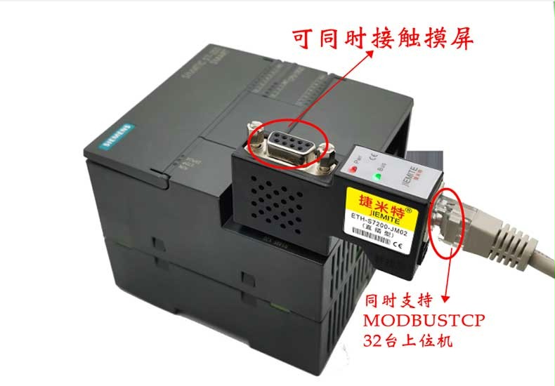 捷米特ETH-S7200不占用PLC編程口,即編程軟件/上位機(jī)軟件通過以太網(wǎng)對(duì)PLC數(shù)據(jù)監(jiān)控和采集的同時(shí),觸摸屏可以通過擴(kuò)展RS485口與PLC進(jìn)行通訊。