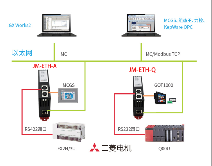 5、支持 MC 以太網(wǎng)協(xié)議(MELSEC Communication Protocol)通信,可以通過上位機系統(tǒng)對可編程控制器進行軟元件數(shù)據(jù)的讀出/寫入,通過上位機軟件(組態(tài)王、MCGS、力控、WinCC、KepWare OPC 服務(wù)器等)選擇三菱以太網(wǎng)驅(qū)動后,方便快捷訪問。