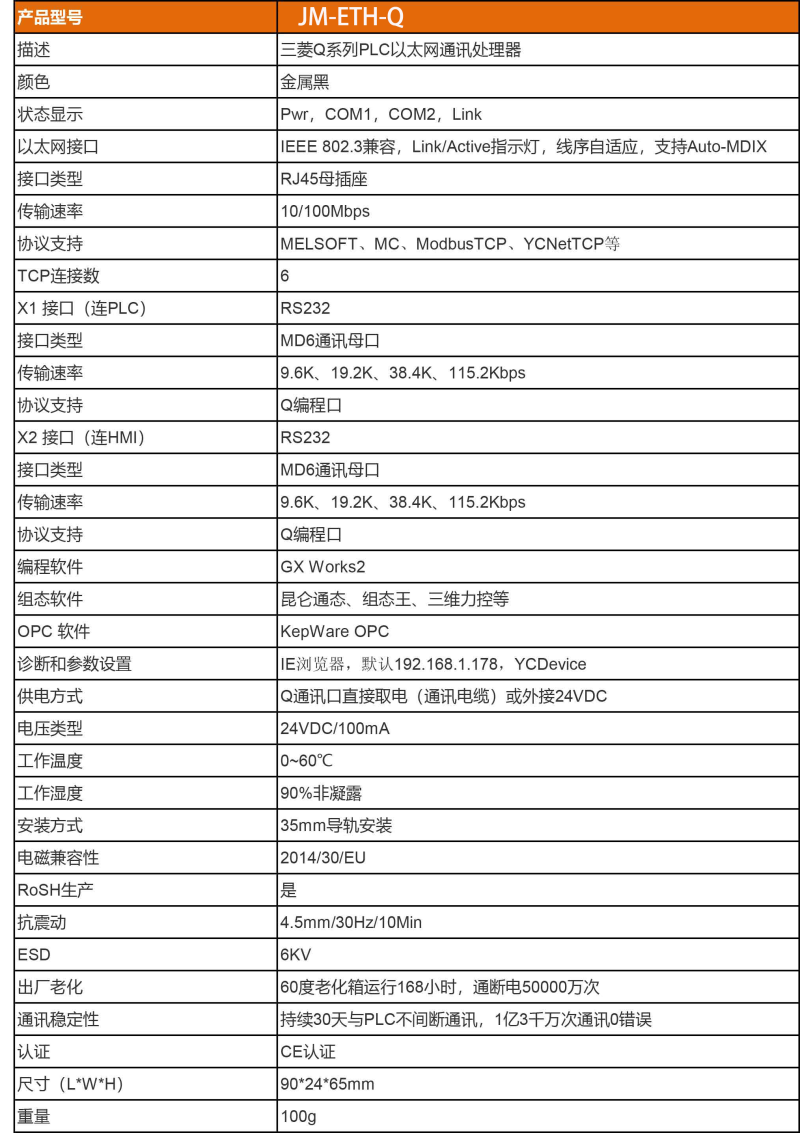 1、安裝在 35mm 的導軌上,COM1 口直接連接至Q 的 MD6 編程通訊口,并擴展一個 COM2 口用于觸摸屏通訊。JM-ETH-Q 可直接從 Q 編程通訊口獲取電源,也可外接 24VDC 電源。