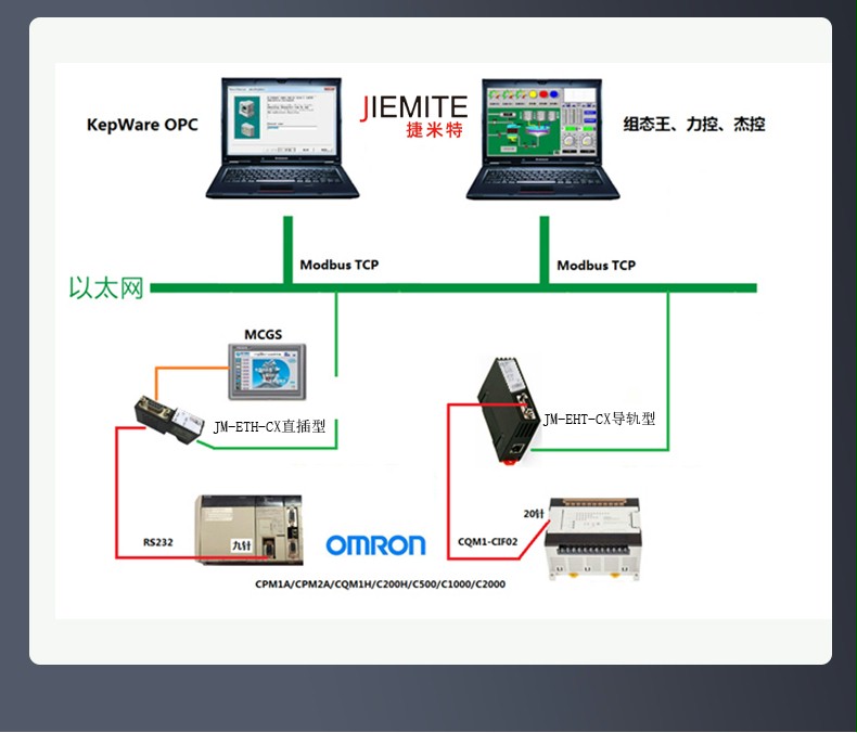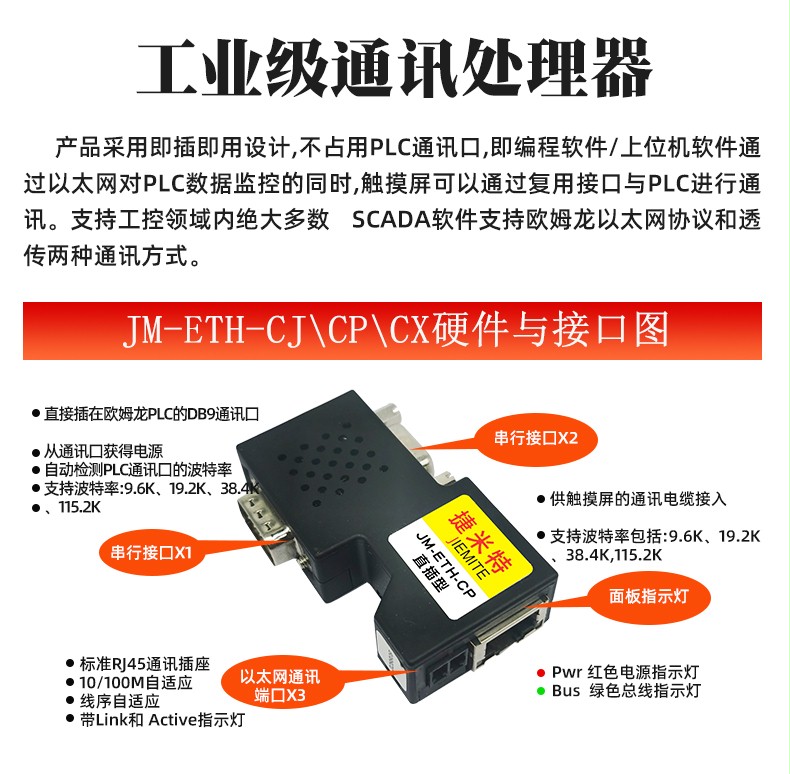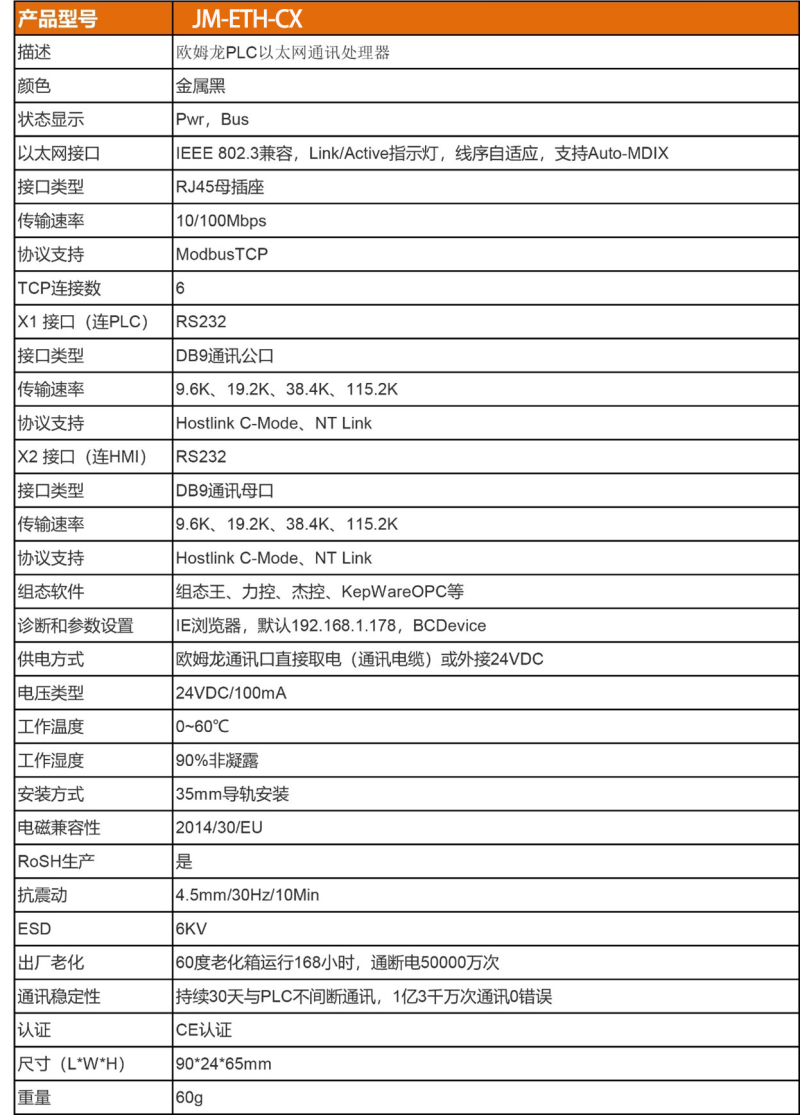JM-ETH–CX 是一款以太網(wǎng)通訊處理器,是為滿足日益增多的工廠設(shè)備信息化需求(設(shè)備網(wǎng)絡(luò)監(jiān)控和生產(chǎn)管理)而設(shè)計,用于歐姆龍 CPM、CQM、C200、C1000、C2000 等多個系列 PLC 的以太網(wǎng)數(shù)據(jù)采集, 非常方便構(gòu)建生產(chǎn)管理系統(tǒng)。