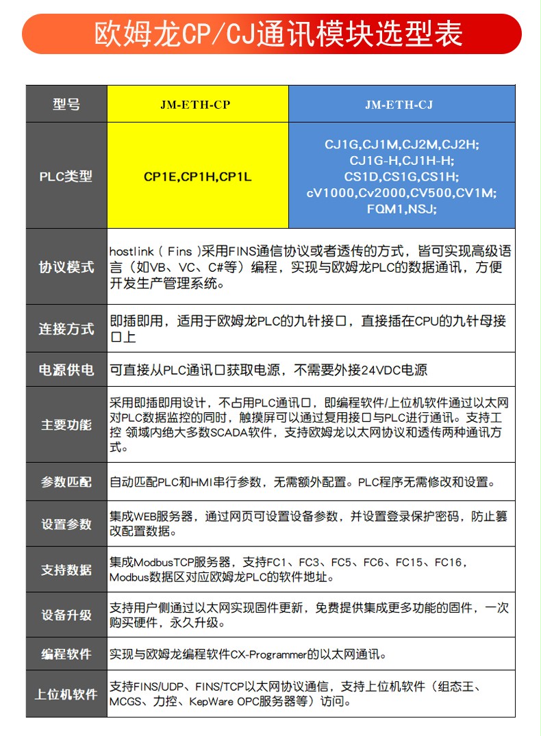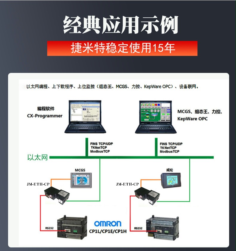 JM-ETH-CP 采用即插即用設(shè)計,不占用 PLC 通訊口,即編程軟件/上位機軟件通過以太網(wǎng)對 PLC 數(shù)據(jù)監(jiān)控的同時,觸摸屏可以通過復(fù)用接口與 PLC 進行通訊。JM-ETH-CP 支持工控領(lǐng)域內(nèi)絕大多數(shù) SCADA 軟件,支持歐姆龍以太網(wǎng)協(xié)議和透傳兩種通訊方式。