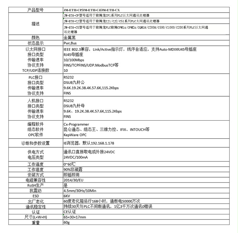 JM-ETH-CP 是一款經(jīng)濟型的以太網(wǎng)通訊處理器,是為滿足日益增多的工廠設(shè)備信息化需求(設(shè)備網(wǎng)絡(luò)監(jiān)控和生產(chǎn)管理)而設(shè)計,用于歐姆龍 CP1L/ CP1E/ CP1H 系列 PLC 的以太網(wǎng)數(shù)據(jù)采集,非常方便構(gòu)建生產(chǎn)管理系統(tǒng)。
