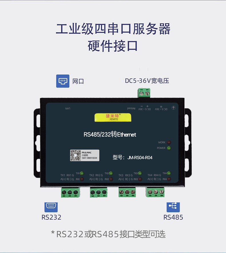 JM-RS04系列產(chǎn)品為可實(shí)現(xiàn)串口與網(wǎng)口互傳的數(shù)據(jù)終端。采用主頻高達(dá)240MHz的雙核高性能MCU,支持寬電壓(5~36V)供電,每路串口對應(yīng)兩路Socket,每路Socket均支持TCP/UDP透傳、HTTP Client、MQTT等協(xié)議,支持SSL/TLS數(shù)據(jù)加密可滿足對數(shù)據(jù)安全的要求。4串口485服務(wù)器每路串口對應(yīng)兩路Socket,每路Socket均支持TCP/UDP透傳、HTTP Client、MQTT等協(xié)議,兼容RS485-TCP/IP-5443D等設(shè)備協(xié)議。