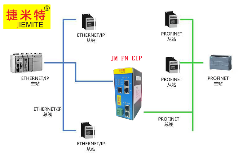 JM-PN-EIP連接到 PROFINET 總線中做為從站使用,連接到 ETHERNET/IP 總線中做為從站使用。