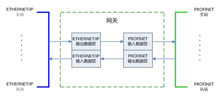 網(wǎng)關(guān)分別從 PROFINET 一側(cè)和 ETHERNET/IP 一側(cè)讀寫數(shù)據(jù),存入各自的緩沖區(qū),網(wǎng)關(guān)內(nèi)部將緩沖區(qū)的數(shù)據(jù)進行交換,從而實現(xiàn)兩邊數(shù)據(jù)的傳輸。