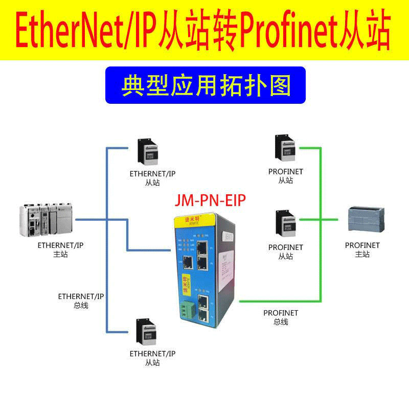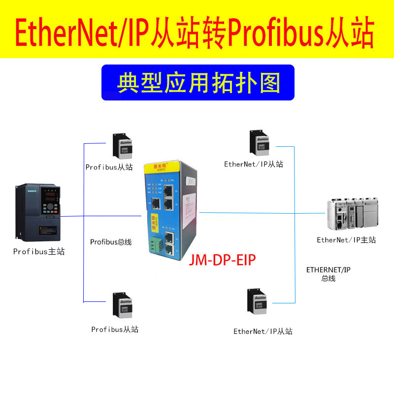 JM-DP-EIP網(wǎng)關(guān)連接到Profibus DP總線中作為從站使用,連接到EtherNet/IP總線中作為從站使用。