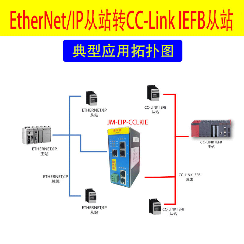 JM-EIP-CCLKIE網(wǎng)關(guān)能夠?qū)崿F(xiàn)EtherNet/IP 接口儀表、變頻器、綜保、軟啟動器等設(shè)備接入到CC-LINK IE FIELD BASIC網(wǎng)絡(luò)系統(tǒng)。網(wǎng)關(guān)在CC-LINK IE FIELD BASIC一側(cè)是CC-LINK IE 從站,在另一側(cè)支持EtherNet/IP 從站。