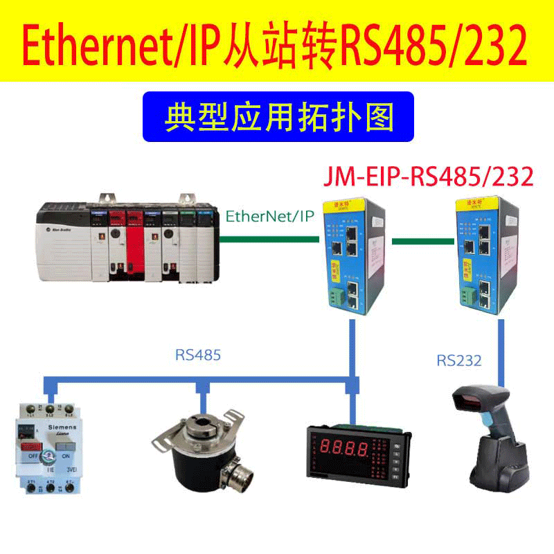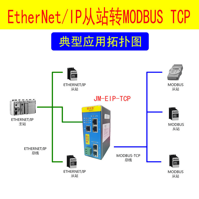 JM-EIP-RS485/232網(wǎng)關(guān)連接到EtherNet/IP總線中作為從站使用,連接到MODBUS-RTU總線中作為主站或從站使用。