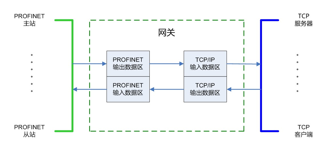 網(wǎng)關(guān)分別從 PROFINET 一側(cè)和 TCP/IP 一側(cè)讀寫數(shù)據(jù),存入各自的緩沖區(qū),網(wǎng)關(guān)內(nèi)部將緩沖區(qū)的數(shù)據(jù)進行交換,從而實現(xiàn)兩邊數(shù)據(jù)的傳輸。