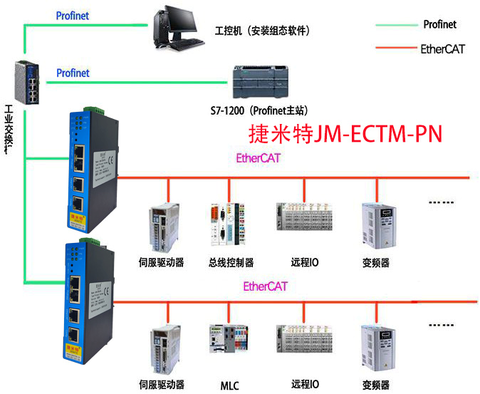 使用場景:西門子 PLC 使用 Profinet 控制 ECAT 從站拓撲圖: