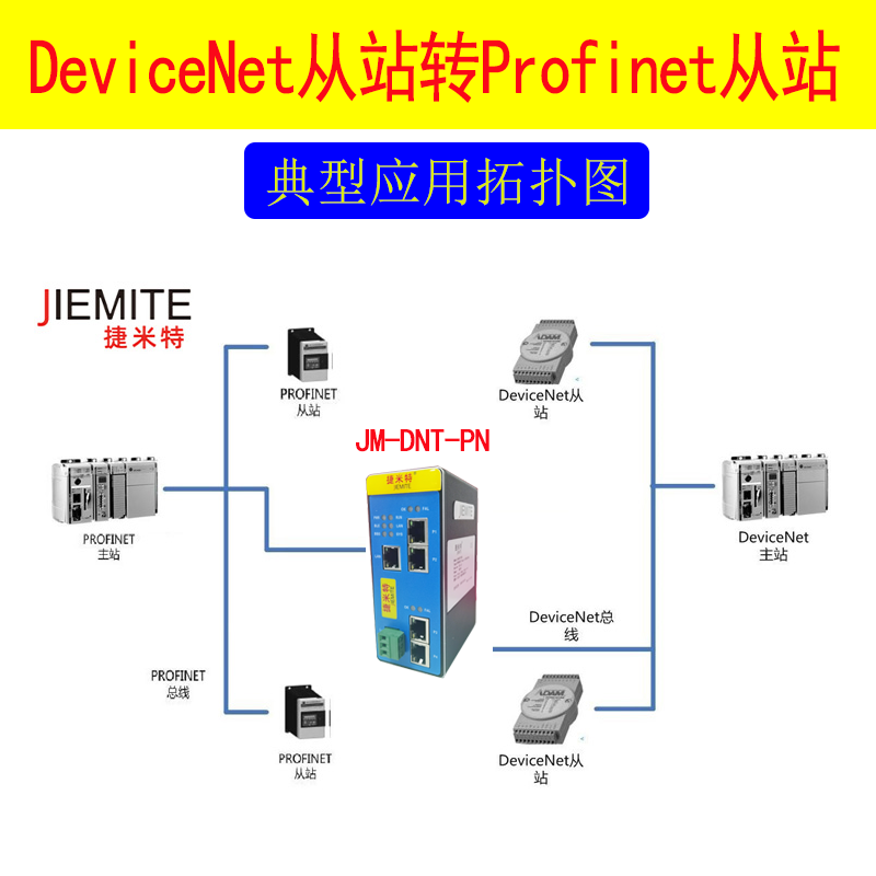 捷米特JM-DNT-PN網(wǎng)關(guān)連接到PROFINET總線中作為從站使用,連接到DEVICENET總線中作為從站使用。