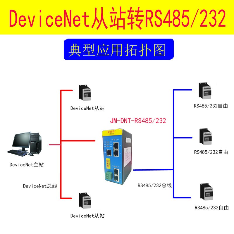 捷米特JM-DNT-RTU網(wǎng)關(guān)實(shí)現(xiàn)MODBUS RTU轉(zhuǎn)DeviceNet功能,能夠?qū)崿F(xiàn)Modbus RTU接口儀表、變頻器、綜保、軟啟動(dòng)器等設(shè)備接入到DeviceNet的PLC或者DeviceNet網(wǎng)絡(luò)系統(tǒng)。