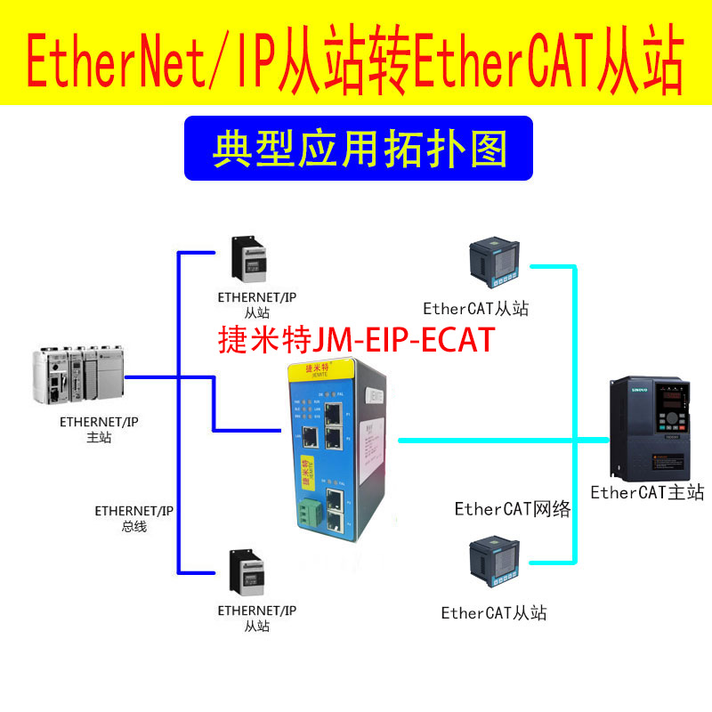 JM-EIP-ECAT連接到ETHERNET/IP總線中做為從站使用,連接到ETHERCAT 總線中做為從站使用。