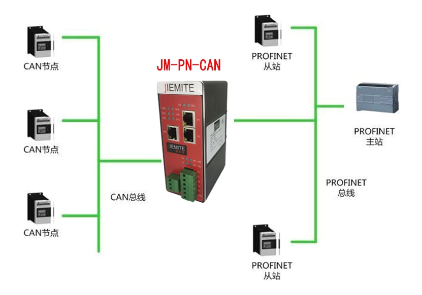 JM-PN-CAN連接到 PROFINET 總線中做為從站使用,連接到 CAN 總線中根據(jù)節(jié)點號進行讀寫。