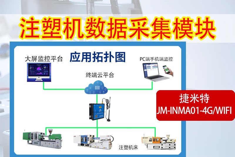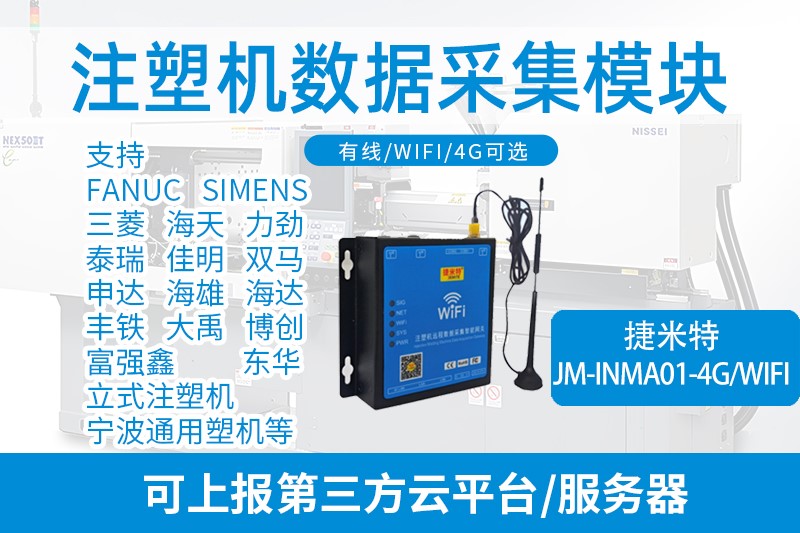 捷米特JM-INMA01-4G/WIFI網關針對工業(yè)現場,各種注塑機床/產線設備/傳感器/儀表/PLC/設備數據采集的通用型云網關,無需注塑機設備生產商開放協議,只需將采集網關設備與注塑機控制器連接,即可對注塑機進行全量數據無損接入,實現注塑機聯網,高性價比,即插即用,兼容100%老舊注塑機及周邊設備,同時網關支持MQTT協議,便于對接本地服務器、云平臺、MES、ERP等第三方系統(tǒng)的數據。專一針對工業(yè)領域設計開發(fā);
